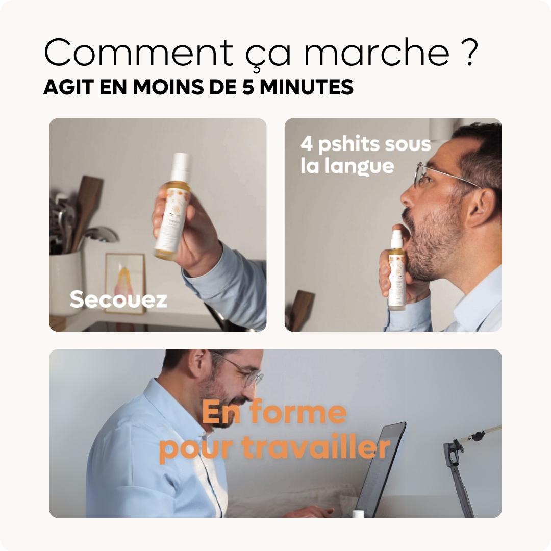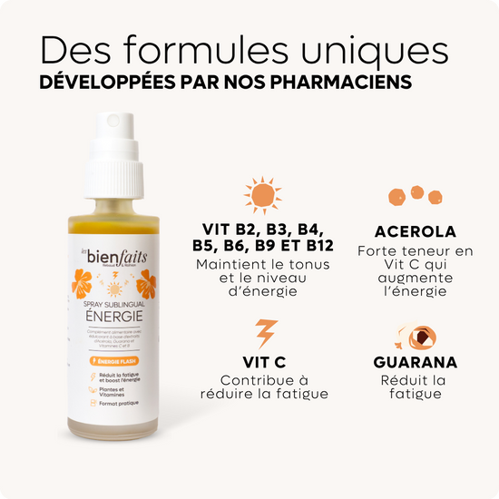 Le spray Energie pour les adultes et Boost-Enegrie pour les enfants dès 3 ans, sont les solutions les plus rapides pour vous donner le coup de boost donc toute la famille a besoin.