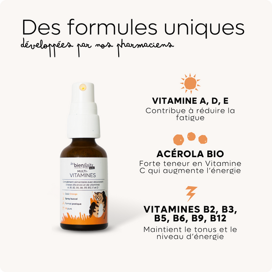 En plus du côté pratique et facile à donner à un enfant, le format spray apporte de nombreux avantages, dont le côté naturel et la conservation qui ne se fait pas au frigo comme les sirops"