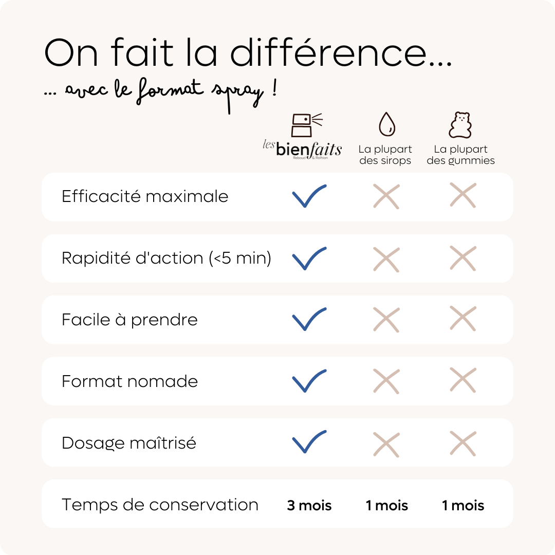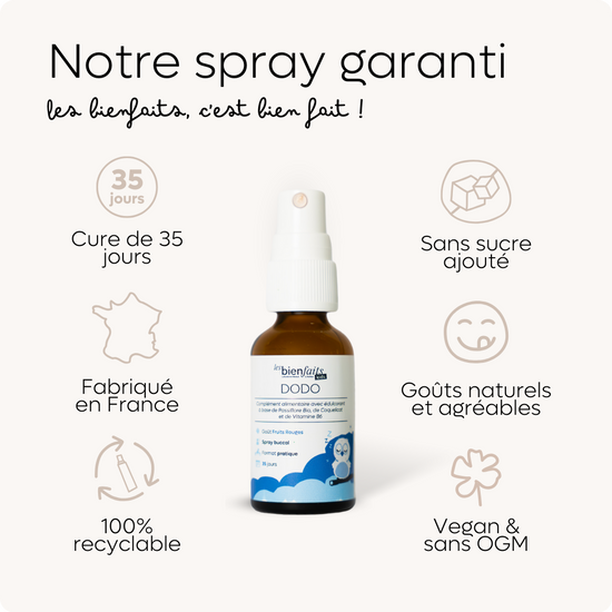 En plus du côté pratique et facile à donner à un enfant, le format spray apporte de nombreux avantages, dont le côté naturel et la conservation qui ne se fait pas au frigo comme les sirops"