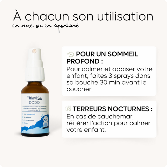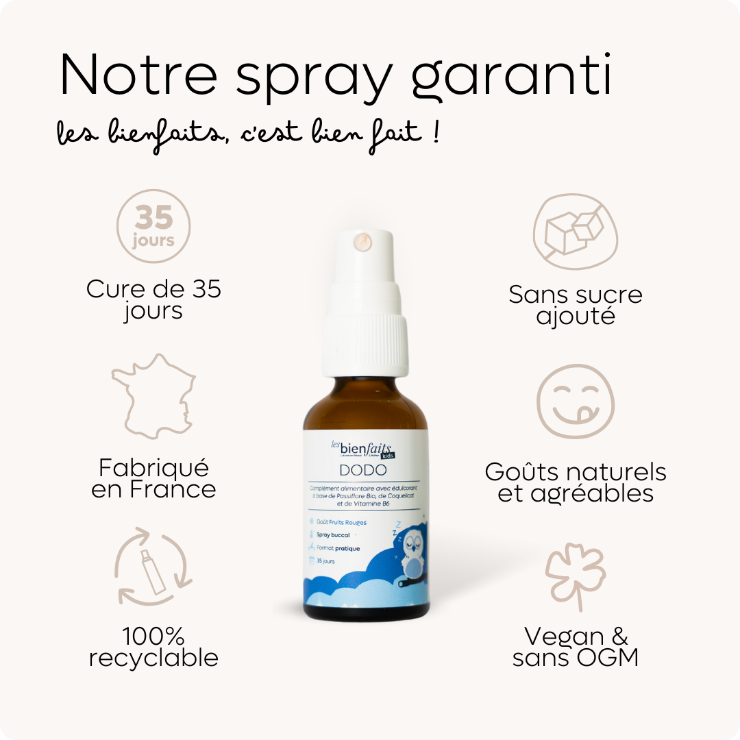 Notre spray DODO pour les enfants dès 3 ans, est la solution la plus rapide pour aidez votre enfant à se détendre avant le coucher
