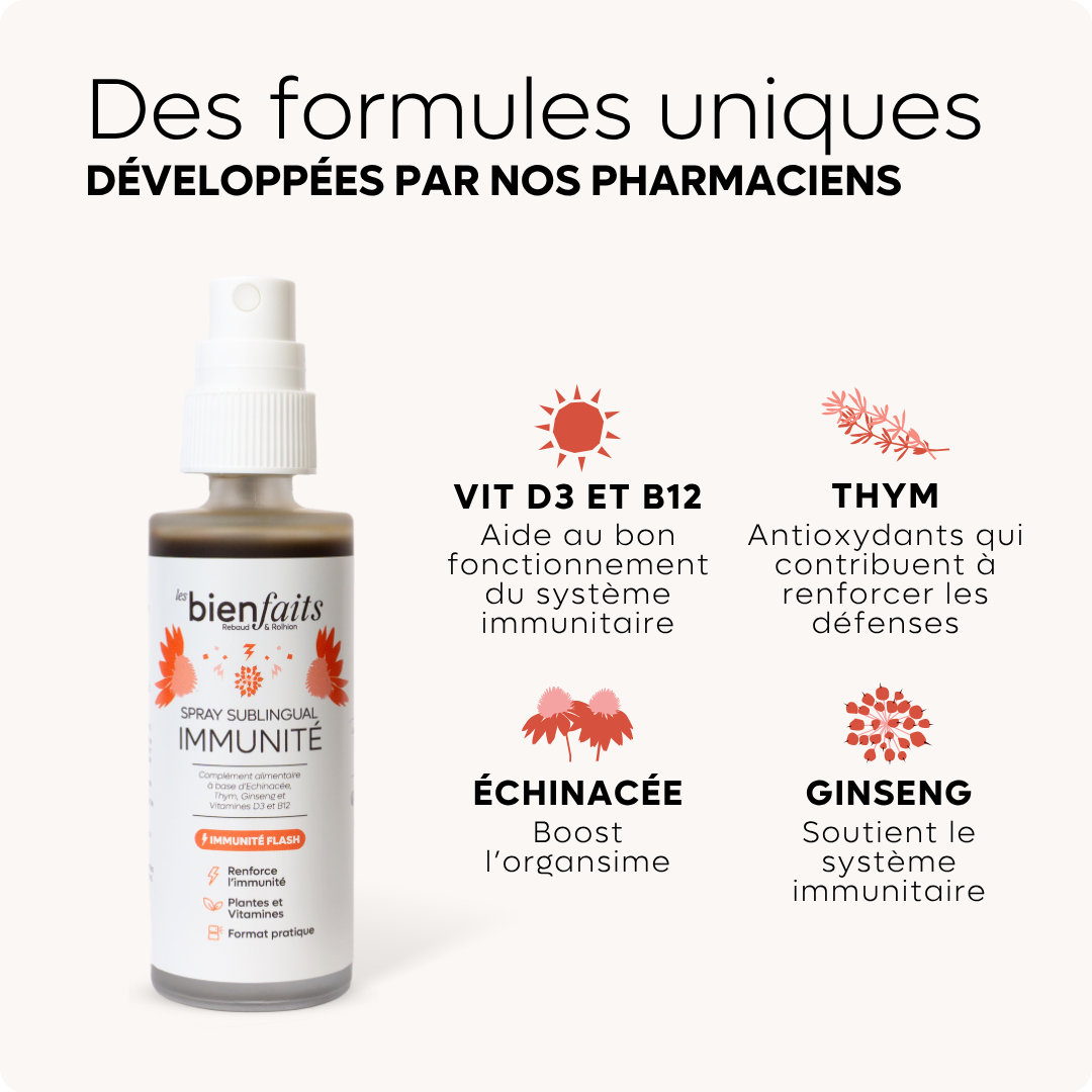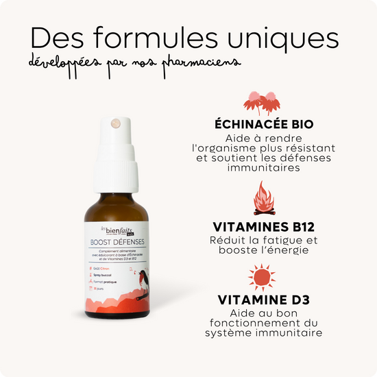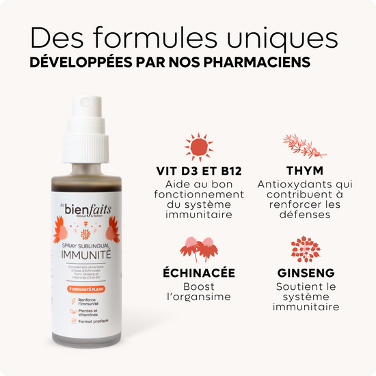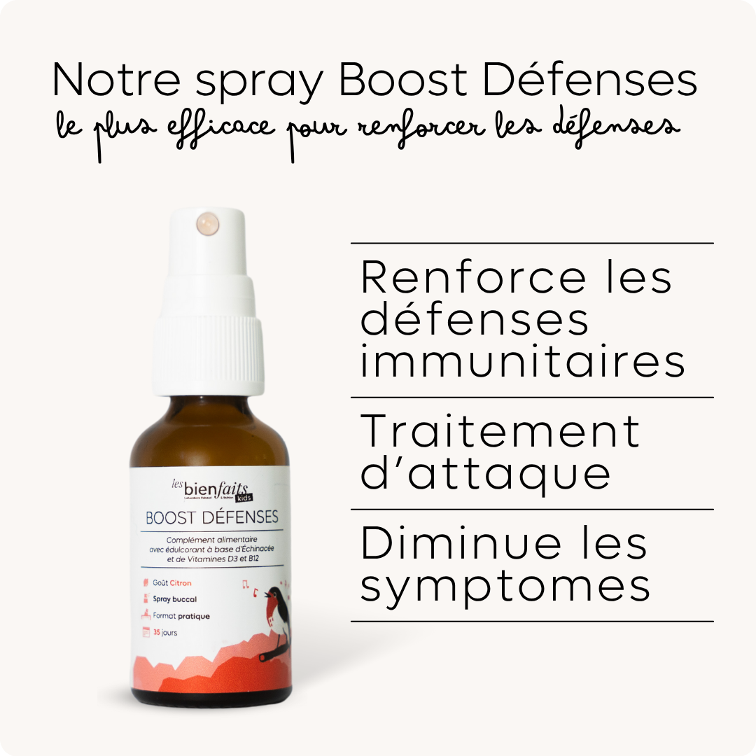 Notre spray Immunité pour les adultes et Bosst-Défenses pour les enfants dès 3ans,  sont les solutions les plus efficaces pour renforcer les défenses immunitaires de toute la famille.