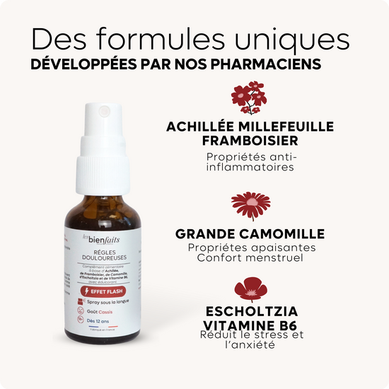 Notre spray Règles Douloureuse est la solution la plus rapide pour réduire vos douleurs de règles légères et modérées.